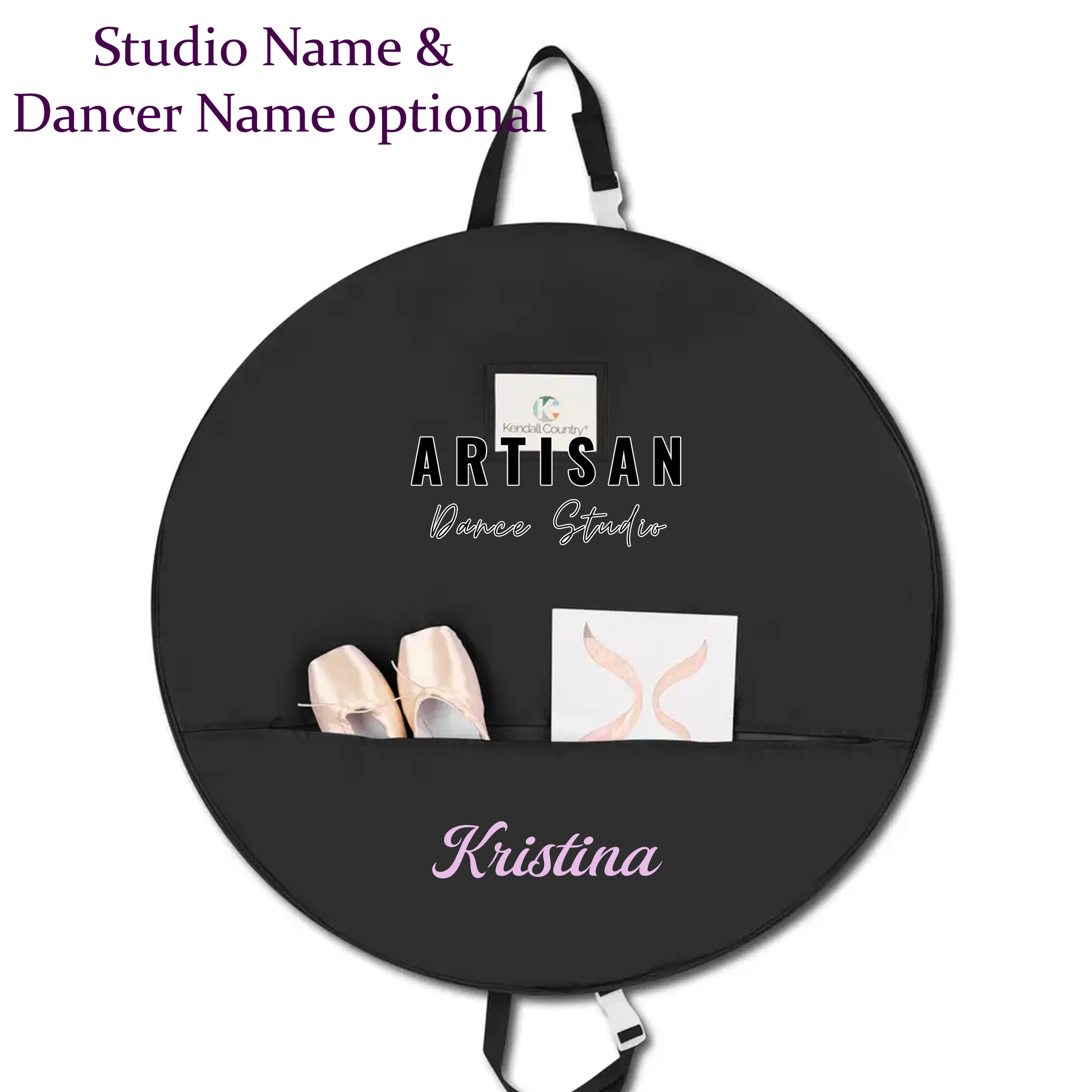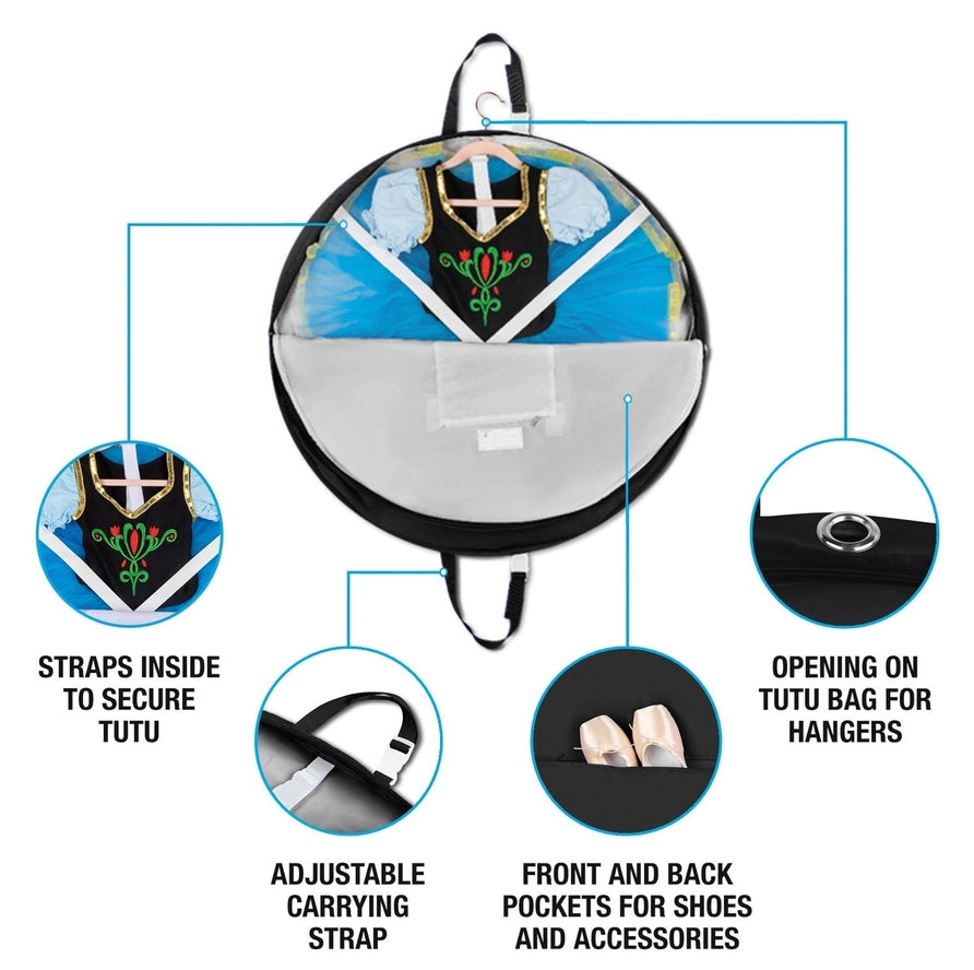 Features: * Inner straps * Hanger Loop * Inside pockets with zippers for small accessories * 2 Outer pockets with zippers for shoes, tights, and accessories * Adjustable carrying straps